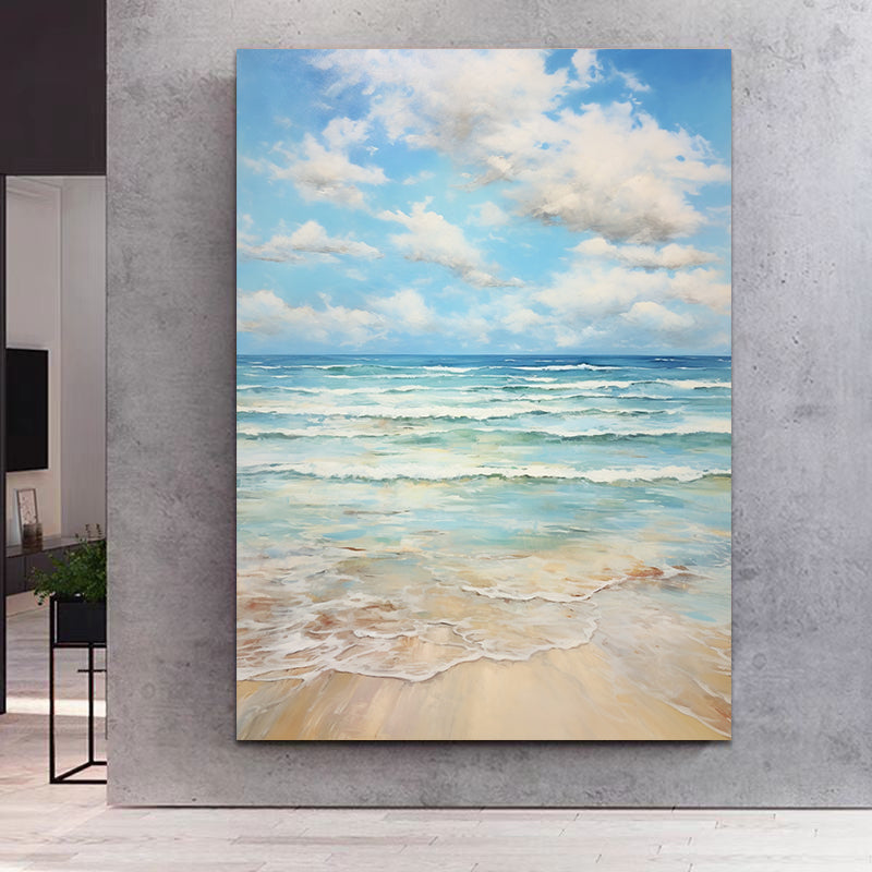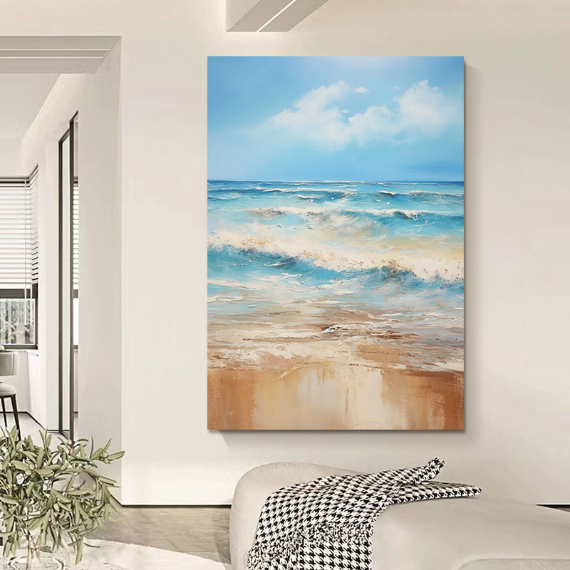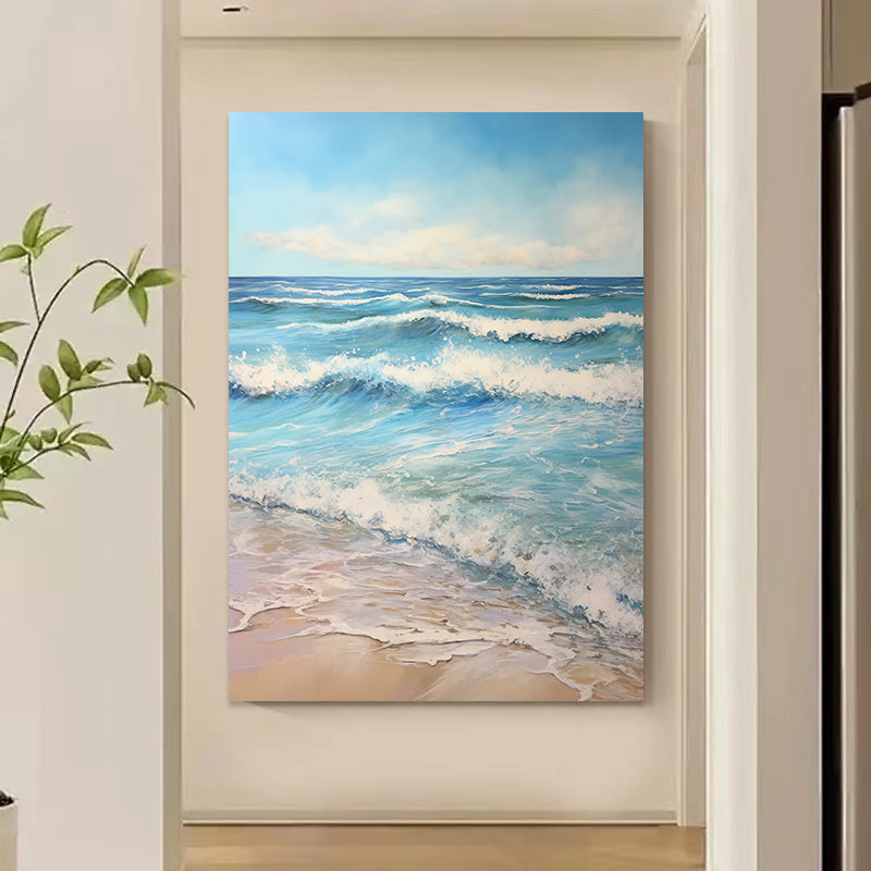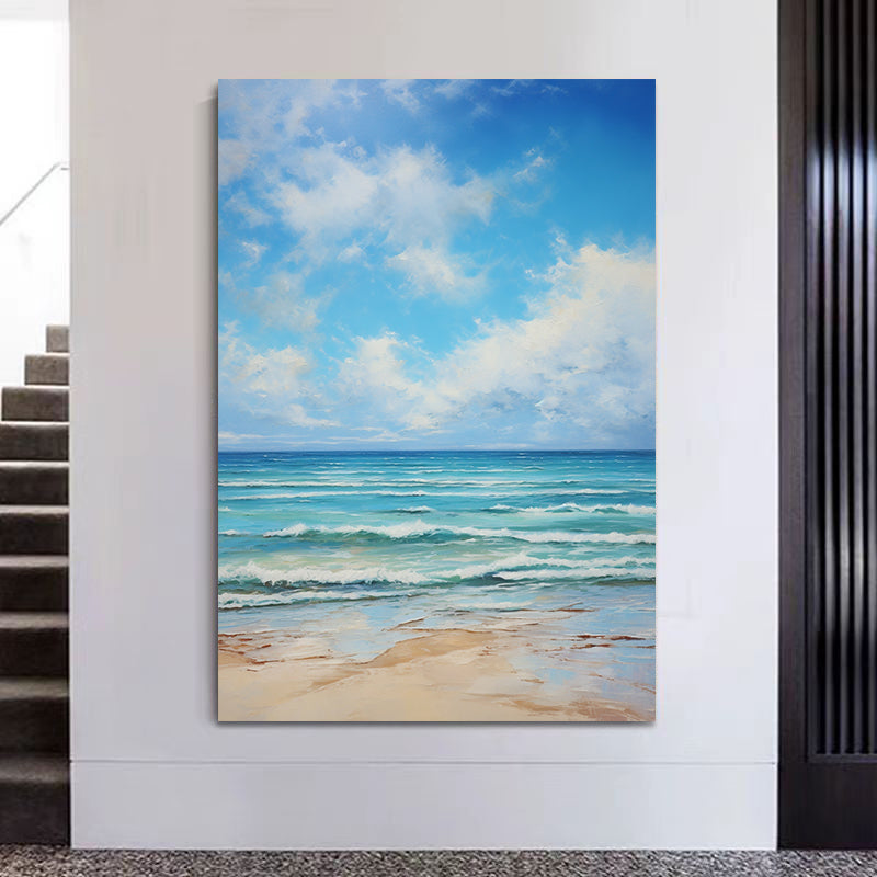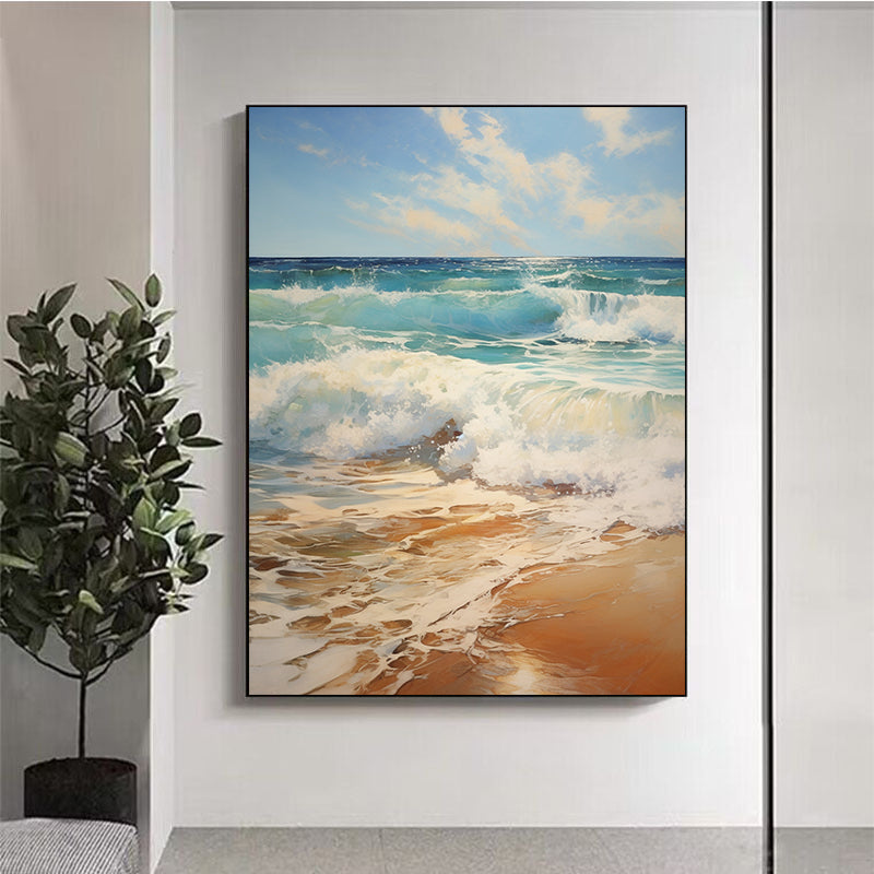 Linen is used as the base, acrylic is used as the paint, and fine sand is added as the beach to make the picture more three-dimensional