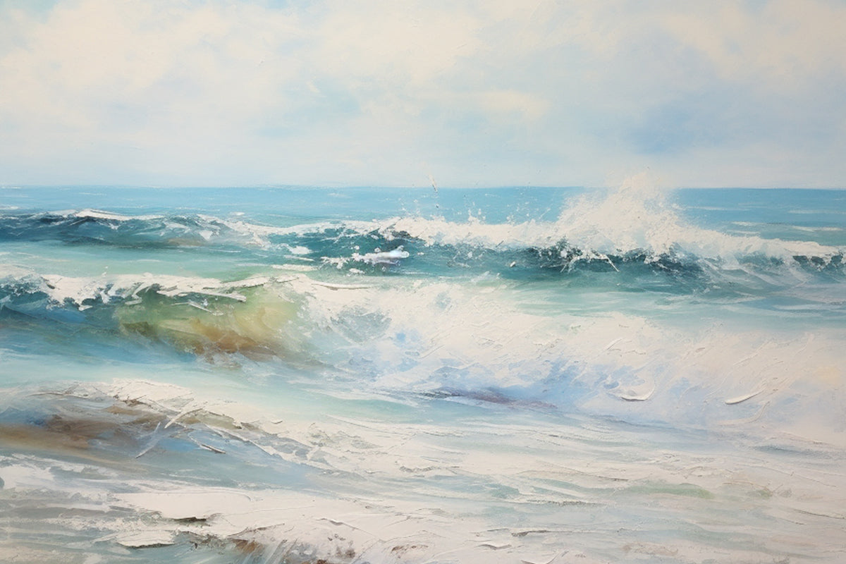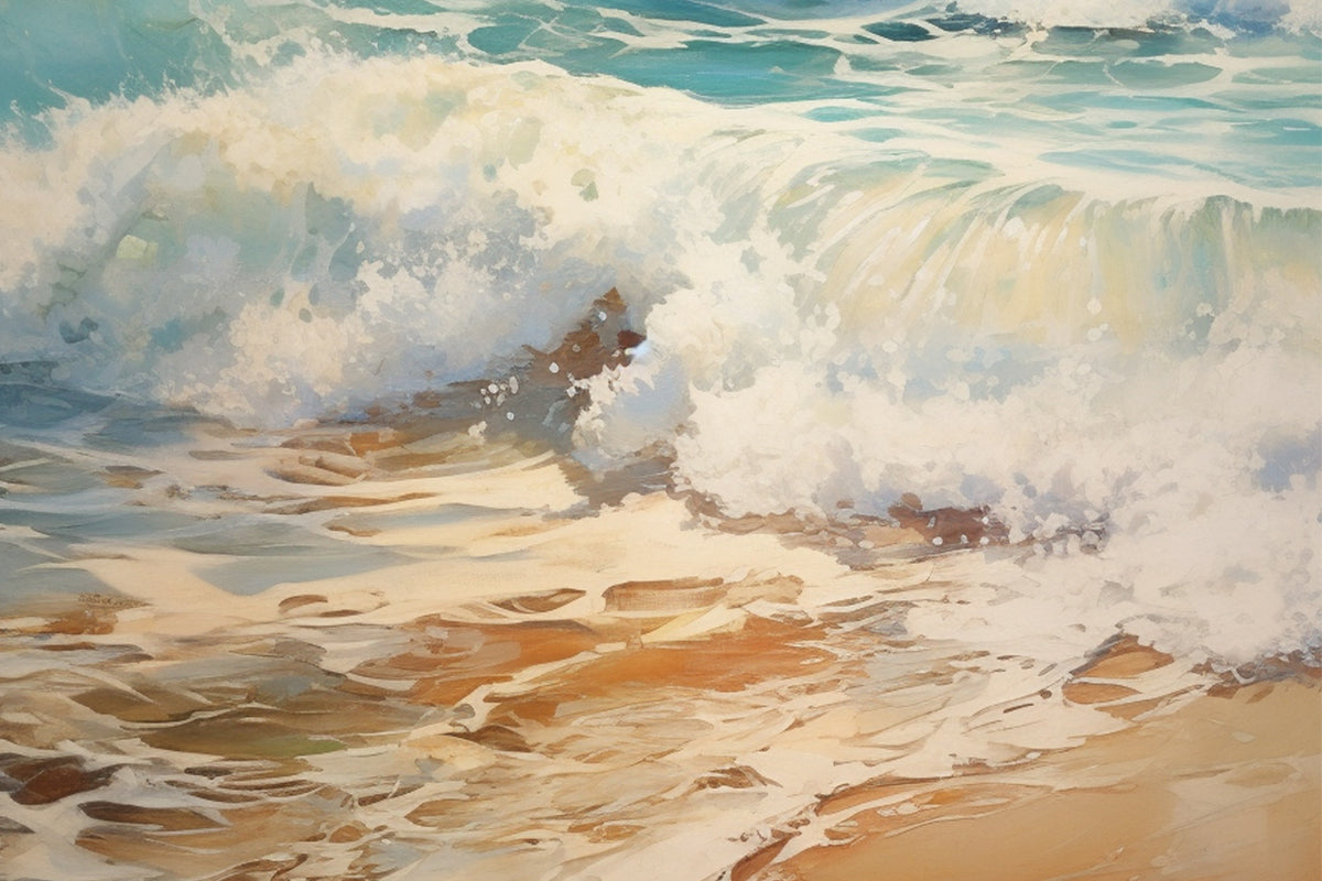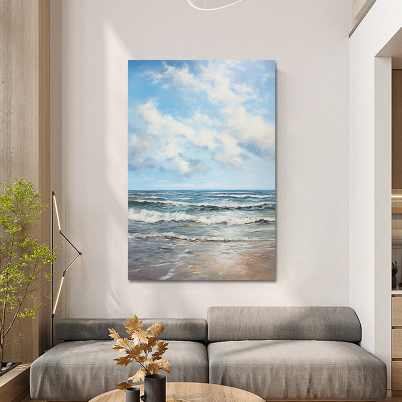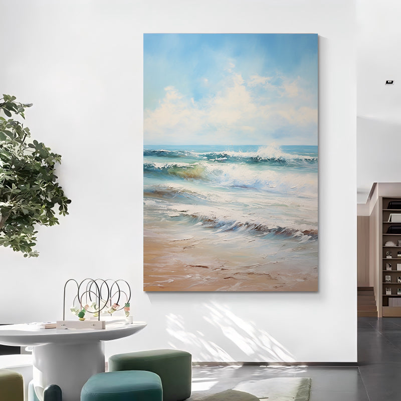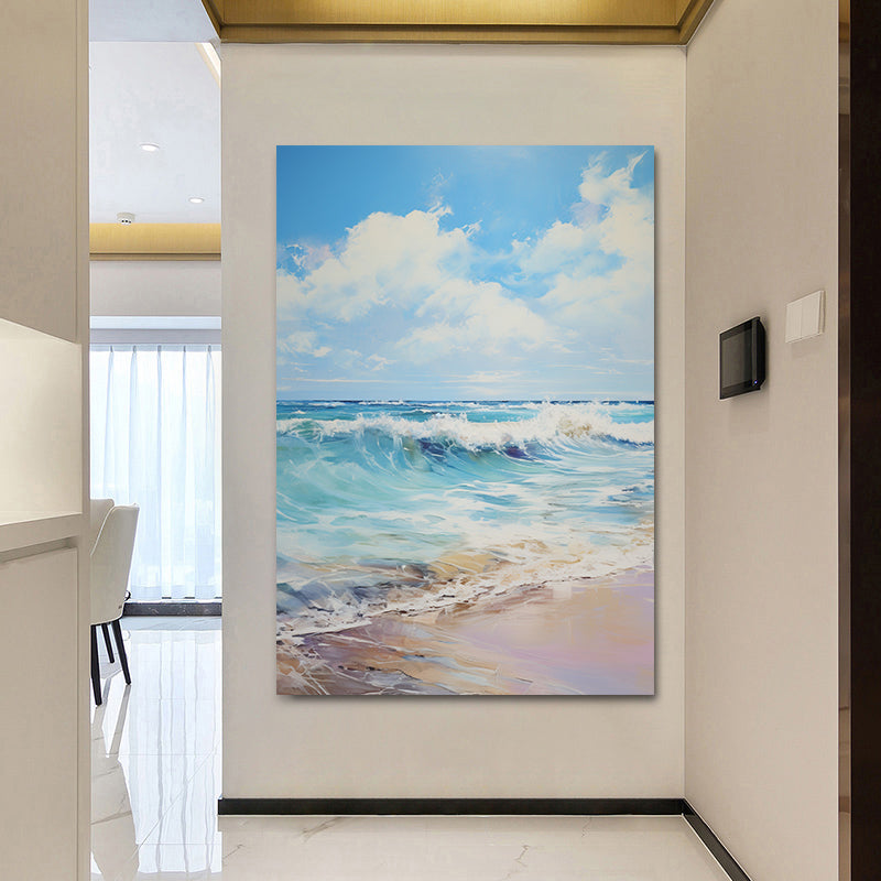 Linen is used as the base, acrylic is used as the paint, and fine sand is added as the beach to make the picture more three-dimensional